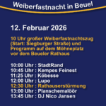 - Beueler Weiberfastnacht 2026 mit Wäscherprinzessin Judith I. – Zugweg und ProgrammDu willst > direkt zum Programm auf der Bühne am Rathaus < hier entlang =) Am 12.02.2026 schlängelt sich der… Beueler Weiberfastnacht 2026 mit Wäscherprinzessin Judith I. – Zugweg und Programm weiterlesen