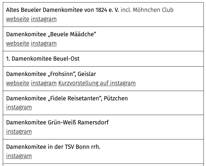 Alle Angaben ohne Gewähr. Informationsstand Juli 2025. Einen Fehler gefunden? Her damit! Bitte direkt eine Mail senden an karneval (at) beuel.net. Danke =)