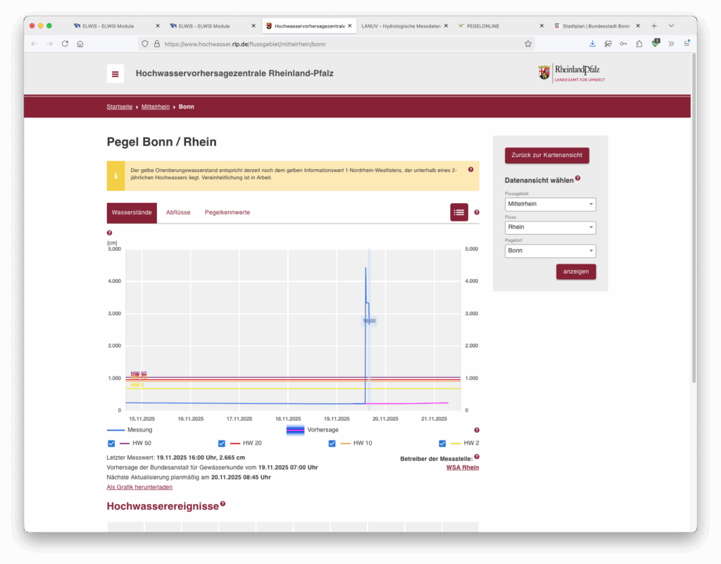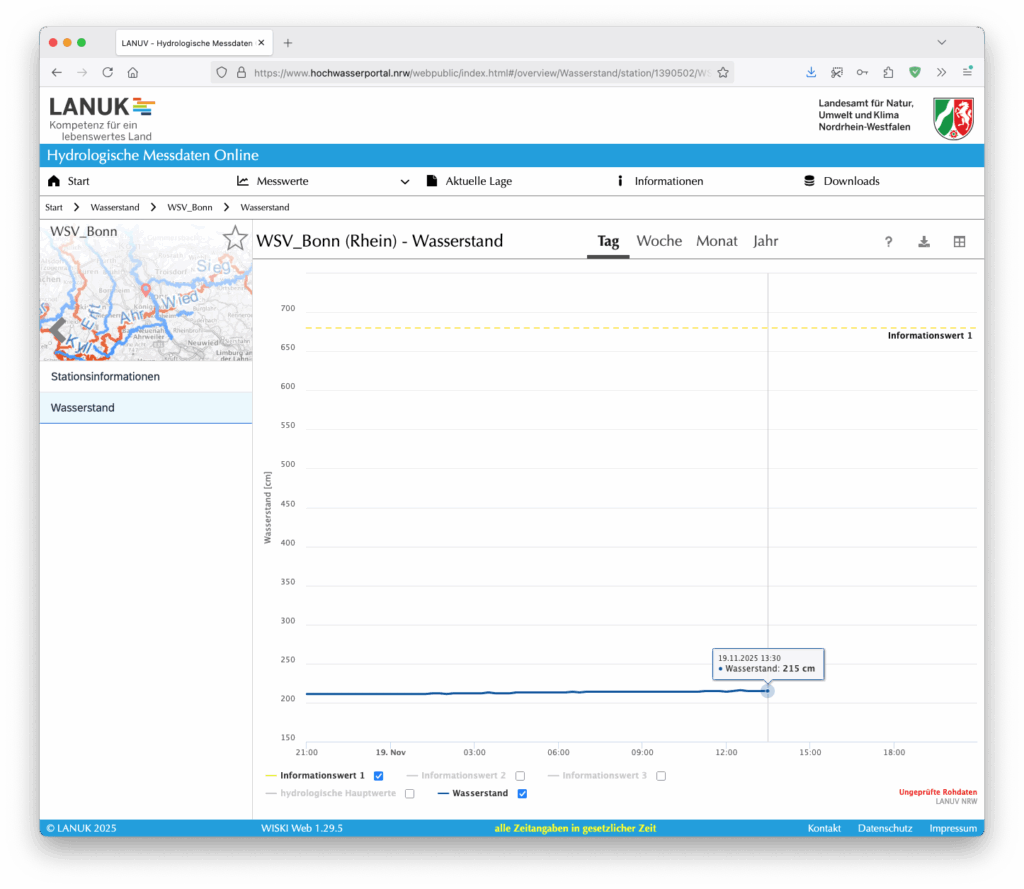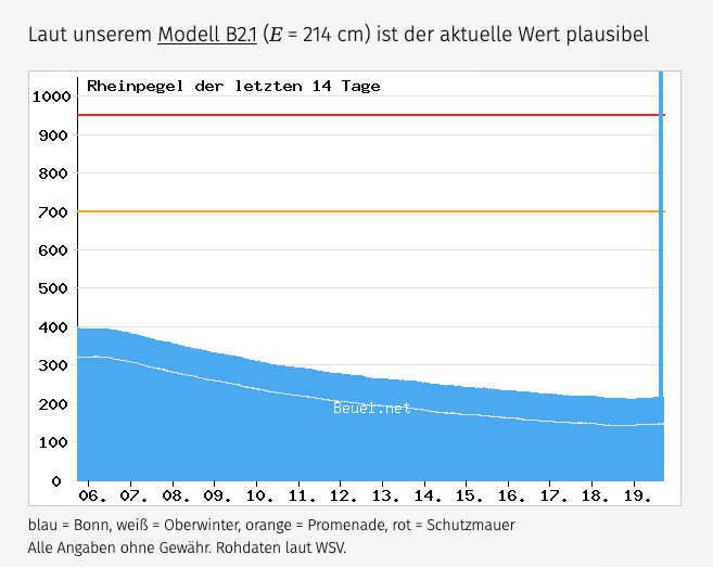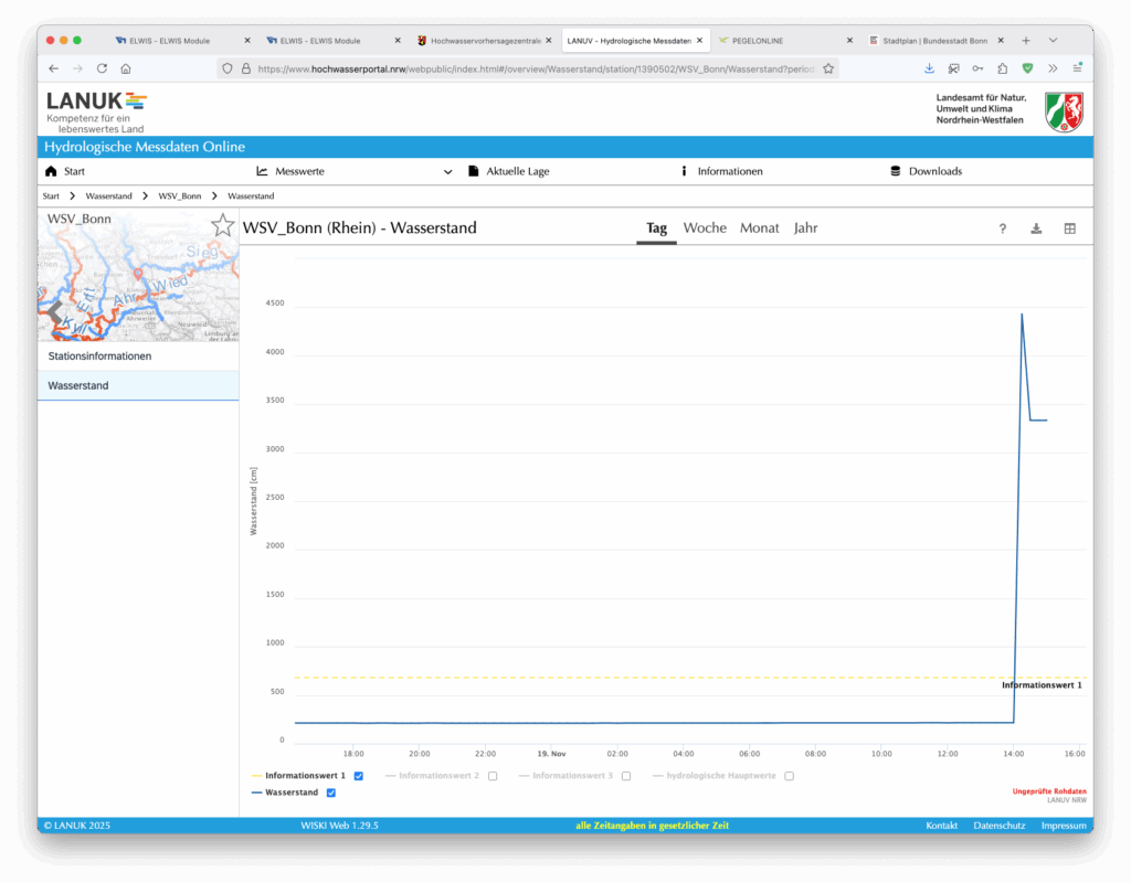 Spannend in diesem Zusammenhang ist, dass sich der Fehler in die angeschlossenen Systeme unverändert propagiert. Dies passt zu unserer Auffassung, dass alle die Daten von der selben Pegelmesseinrichtung am Ufer in Bonn beziehen.