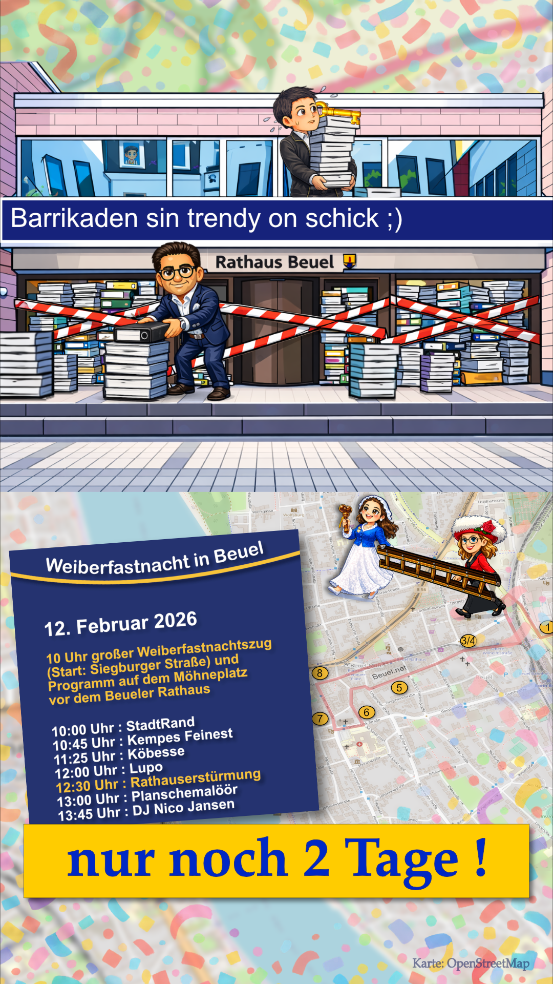 Eine Karte zeigt den Zugweg des Weiberfastnachtszug in Beuel. Hinter einem Schild mit Angaben zum Programm auf der Bühne schaut die Wäscherprinzessin Judith I. mit einem Fernglas gen Rathaus. Vielleicht gibt es eine gute Möglichkeit wie sie in 9 Tagen an den Schlüssel kommt? Der Bürgermeister bekommt von all dem nichts mit.