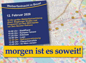 - Beueler Weiberfastnacht 2026 mit Wäscherprinzessin Judith I. – Zugweg und ProgrammUpdate 09.02.2026 – Du willst direkt zum > Programm auf der Bühne < hier entlang =) Am Donnerstag 12.02.2026 schlängelt sich der Weiberfastnachtszug kreuz und quer durch Beuel. Die Wäscherprinzessin Judith I. fährt traditionell auf dem letzten Wagen des Karnevalzuges, begleitet von ihren beiden Wäscherinnen Jule und Lea und beschützt von ihren Bützoffizieren der Beueler… Beueler Weiberfastnacht 2026 mit Wäscherprinzessin Judith I. – Zugweg und Programm weiterlesen
